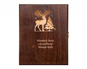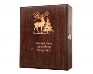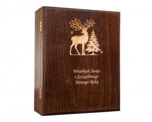 Brązowa Drewniana Skrzynka świąteczna z butelką 2 szkl grawer prezent BD-16